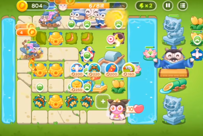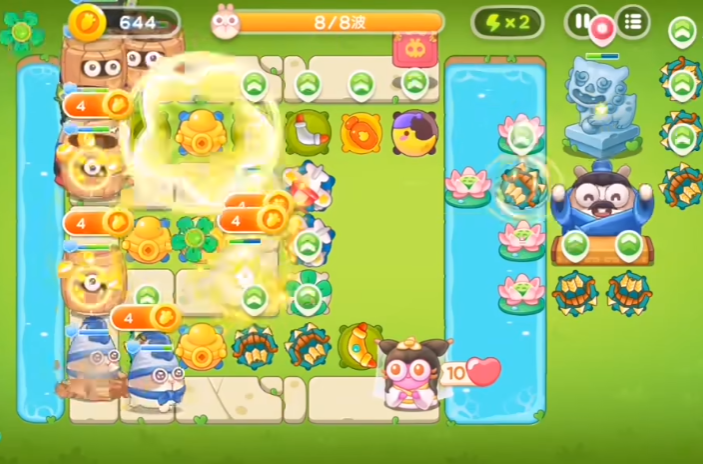 最后阶段要把右下方道具清干净,拆掉下方两个多重箭换成右上一个多重箭,荷叶上也要放个多重箭。暂停游戏把右边多余的多重箭拆掉,在中下位置放三个多重箭,这样火力就完全够用了。最终布局要保证每条路线都有足够火力覆盖,特别是多重箭要升到满级,这样才能轻松守住最后一波。
