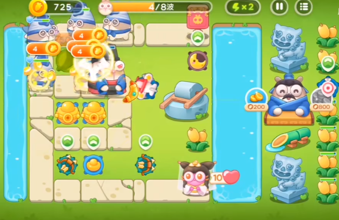 开局咱们先在左上角放一个元宝和一个飞镖,这两个炮塔能帮你稳稳度过第一波。元宝打钱快,飞镖清怪效率高,搭配起来特别顺手。第二波来了记得在中左位置补个飞机,旁边再放个元宝,这样火力就够用了。前期重点是多打钱袋子和道具,攒够钱才能布置更多炮塔。