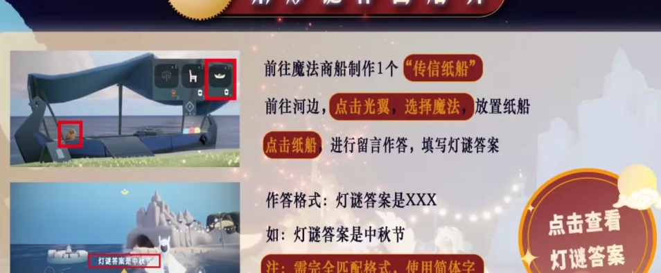 完成灯谜任务需要严格遵循答题格式,通常要求输入灯谜答案是+正确答案的固定句式,不能添加多余标点或文字。错误格式可能导致无法领取奖励。每日灯谜内容会更新,过期答案将失效,建议玩家在活动期间每日参与。纸船可通过遇境商船花费2根蜡烛购买,或每日登录领取免费魔法获得。