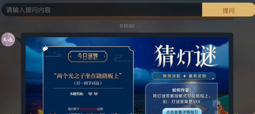 光遇灯谜任务是中秋节期间推出的限时活动,玩家通过参与猜谜可获得爱心、季节蜡烛等奖励。活动入口位于游戏右上角的设置图标内,点击进入精灵界面即可找到中秋灯谜选项。每日灯谜会以文字形式呈现,玩家需在纸船上输入指定格式的答案,系统验证正确后自动发放奖励。