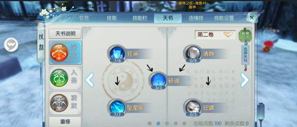 如果喜欢高爆发玩法,可以主点浴火天书第一卷的千耀,这样输出会非常猛。但别忘了烈山本身控制技能不多,所以炫光诀也得点1级,虽然眩晕时间短,但关键时刻能打断对手节奏。至于三云龙这种前摇长的技能,点1级就够了,减速效果差别不大,没必要浪费技能点。