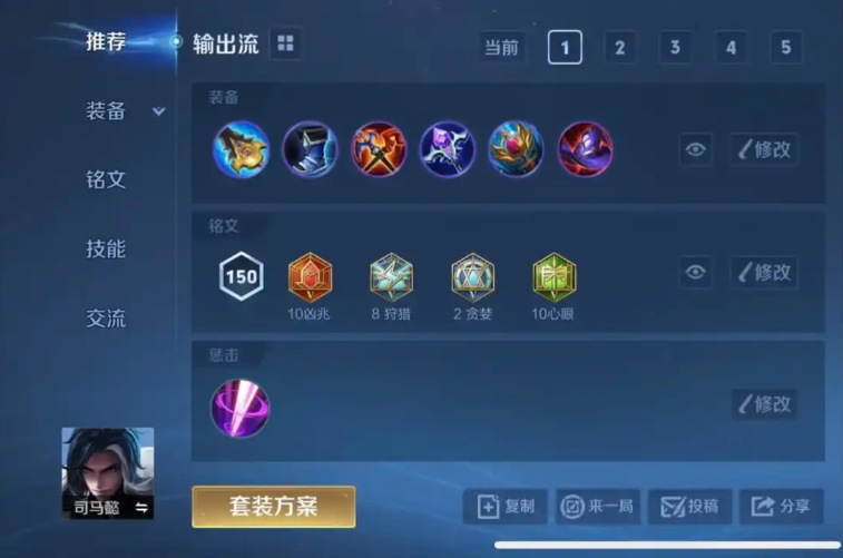 除了纯法术输出流,司马懿也可以选择带有物理暴击属性的出装路线。这种思路会围绕无尽战刃和闪电匕首来构建,利用司马懿强化普攻可以暴击的特性,追求极致的单次爆发伤害,往往能出现一刀秒杀脆皮的情况。但需选择这条路线时,吸血装备仍然必须选择噬神之书而非物理吸血刀,因为他的普攻伤害类型是法术伤害。为了补充生存能力,后期通常会补上复活甲或名刀司命这类保命装。