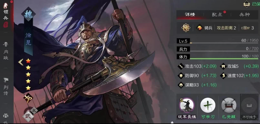 四星曹仁作为魏国骑兵武将,凭借均衡的属性和强力的控制战法,在游戏中具有较高的实用价值。他的基础战法八门金锁能使敌军群体陷入怯战状态无法普通攻击,持续两回合,可有效克制依赖普攻的菜刀队。曹仁的防御成长属性达1.63,仅次于四星周泰,结合骑兵兵种特性使他能胜任前锋或中军位置,尤其是在开荒阶段表现突出。