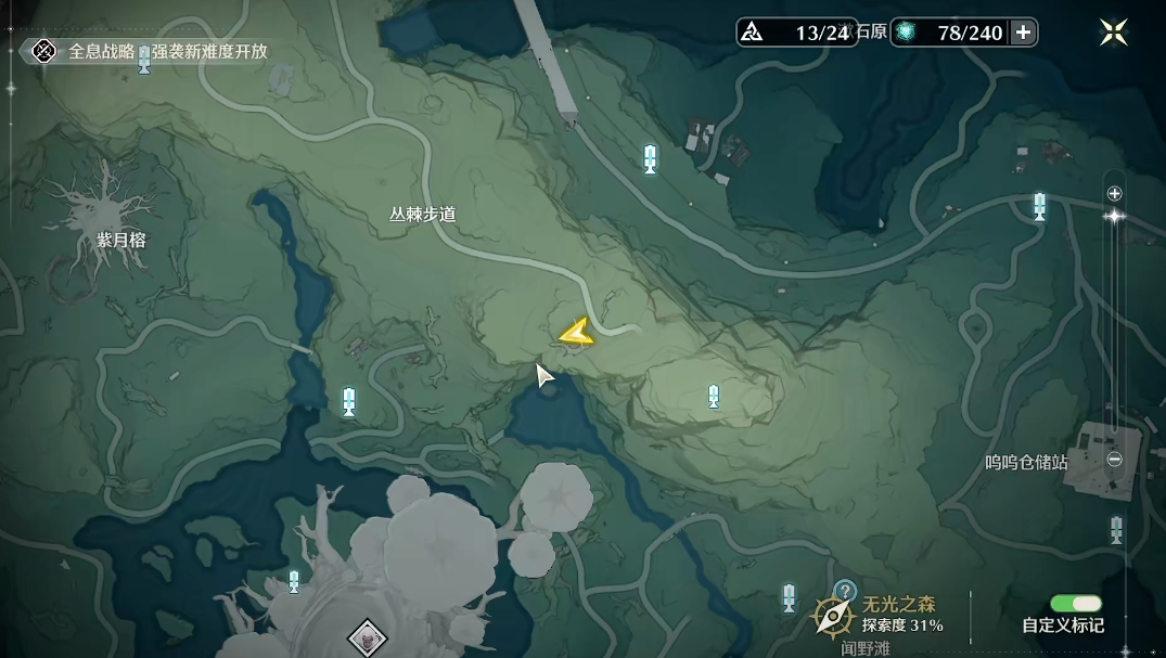 丛荆步道位于游戏地图的丛棘步道上方区域,玩家可以通过打开地图并定位到图示的指定位置快速到达这个探索区域。这个区域分布着多种隐藏宝箱,需要玩家仔细寻找和完成特定步骤才能解锁,获取其中的珍贵奖励如潮汐之遗。