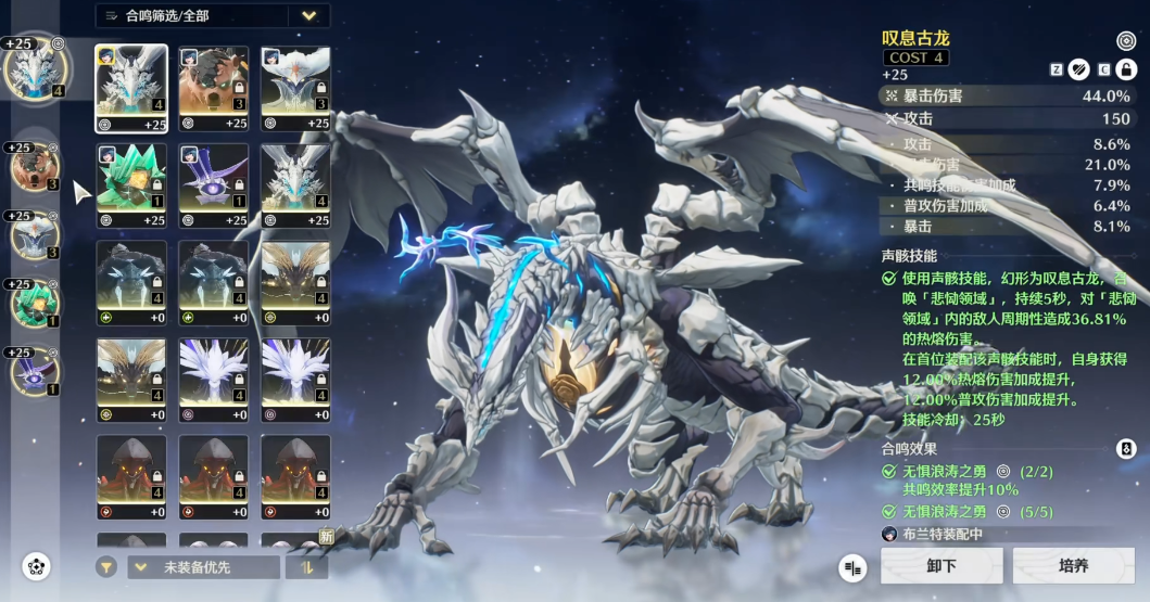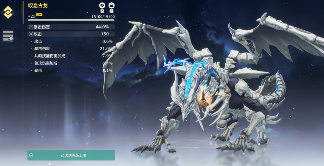叹息古龙通常占据4点COST值,属于高价值的核心声骸位。它的主要属性词条提供了多样化的选择方向,玩家可以根据角色需求,在暴击率、暴击伤害、百分比攻击等输出向属性中进行取舍,以进一步放大角色的优势。其固定的攻击属性作为基底,确保了基础的伤害能力。而在副词条的追求上,进攻类属性如双暴和攻击力自然是优先选项,提升共鸣效率也能帮助角色更频繁地释放关键技能,与套装效果形成联动。