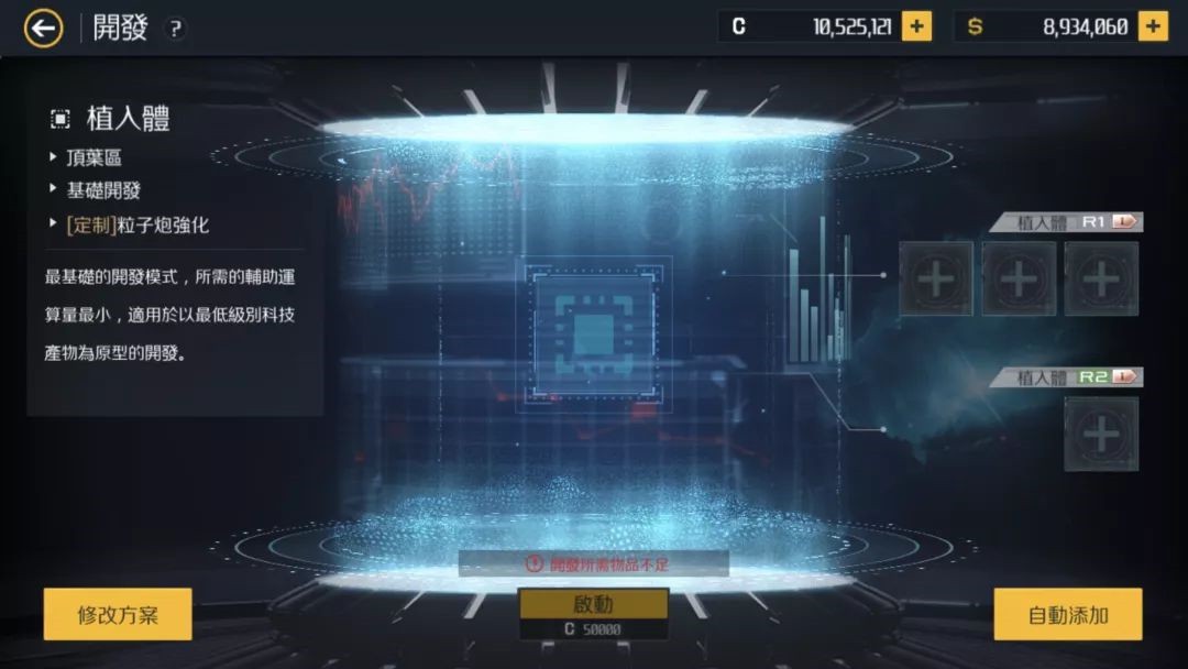 游戏中的开发定制功能让玩家能更精准地打造符合自身定位的植入体。开发功能位于空间站内,停机坪上方、科研右侧的位置。每次开发需要消耗三个低一级的植入体和一个更高一级的植入体,通过合成来获得属性更集中、品质更好的定制植入体。这是提升角色评分和战斗效能的关键途径。