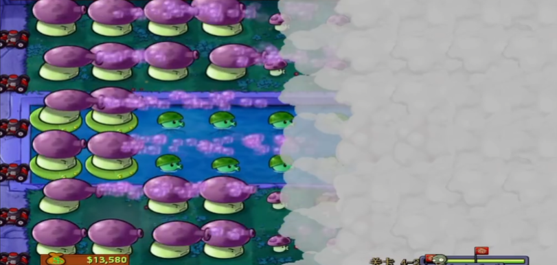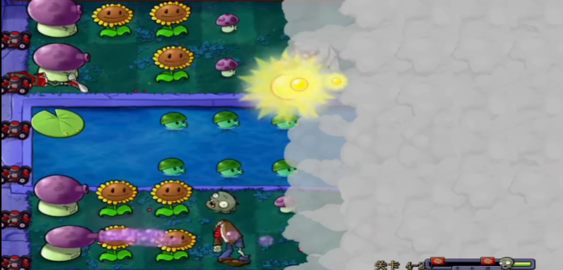 开局布局应优先解决阳光生产和基础防线问题。由于是黑夜关卡,阳光菇是必须的基础生产植物,在阳光菇产阳光较少的初始阶段,建议使用如小喷菇这类不消耗阳光的植物配合土豆雷进行过渡,以拖延僵尸进攻并积累最初的阳光资源。你需要迅速在泳池每行的中央位置铺设睡莲,为后续的水路防守做好准备。陆地区域的前排,特别是最右侧两列,需要尽快放置坚果墙,以保护后排的阳光菇不被快速突破。