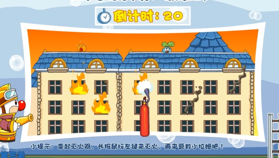 最后一关就是真刀真枪的实战演练了,也是考试最难的部分。场景里会模拟一个着火的小房子,你的任务是在三十秒之内,用灭火器扑灭所有火焰,并且把困在里面的小拉姆给安全救出来。操作时需要你先去拾取灭火器,然后移动角色,让灭火器喷出的白色雾气对准火苗,长按屏幕不放持续喷射,直到所有火都被扑灭。火灭了之后,你还要记得去操作旁边的梯子,先把灭火器放下,然后再点一次梯子,梯子会架到楼上,小拉姆就会自己顺着梯子爬下来。整个过程需要你熟练控制方向和操作顺序,时间比较紧张,得多练习几次才能掌握好节奏。