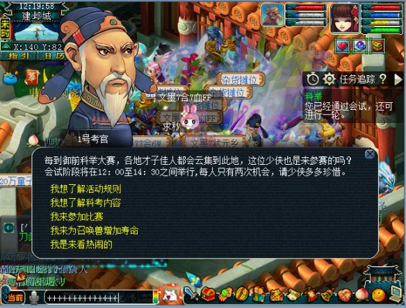 跑图路线要提前规划好,考官位置必须烂熟于心。比如1号考官在建邺衙门附近,4号考官在傲来西瓜摊边上,别跑错地方浪费时间。自动寻路虽然方便,但有些考官位置刁钻,手动跑反而更快。按下F9屏蔽其他玩家,避免被摊位挡住视线,点考官时手要稳,别点歪了耽误时间。