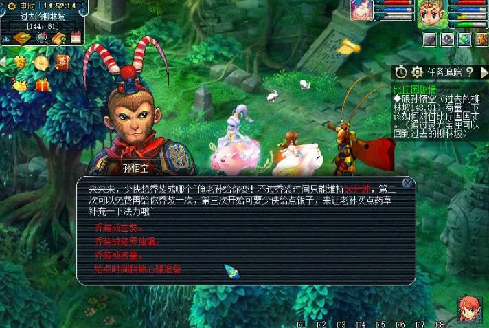 使用灵光宝匣回到过去找孙悟空,他会带你去柳林坡救小孩,这里需要组队战斗,主怪会使用烈火,建议带上辅助门派。之后找孙悟空乔装成玄奘、傀儡或孩童,每种乔装对应不同玩法,比如弹琴、按提示攻击怪物或画画。完成乔装任务后,可以选择直接对付白鹿精或追踪狐狸精,两条分支的奖励和难度相同。