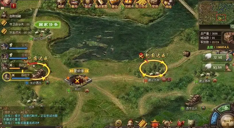 攻城掠地群雄割据玩法是本服任意一国达到二级王朝条件后解锁的特殊模式,分为预告、战斗和结果展示三个阶段。战斗阶段从周一9点持续至周二22点,玩家需通过征战地图中的NPC势力和其他国家争夺领土。地图初始会随机分配三个国家出生点,周围有固定已占领城池,同时存在7个预设NPC势力,每个势力占据若干城市并设有主城。击败NPC主城可判定消灭对应诸侯势力,这是获取奖励的关键节点。