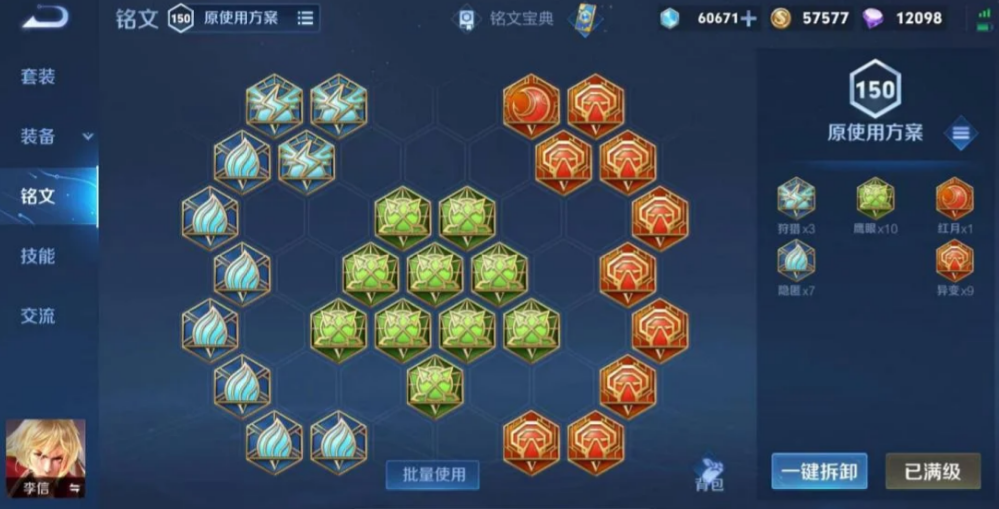 铭文搭配方面推荐以百穿铭文为基础,选择9异变、1祸源、10鹰眼和7隐匿3狩猎的组合。 这套铭文提供高额物理穿透和攻击力加成,1个祸源铭文能偶尔触发幸运暴击,隐匿提升移速和攻击力,狩猎则弥补攻速需求,使技能衔接更流畅。 红色和绿色铭文强化前期对线压制力,蓝色铭文平衡机动性和输出,让光信在清兵和消耗时更高效。 新手玩家可以优先采用这套标准搭配,它能在游戏早期建立优势,同时中后期配合装备进一步提升伤害潜力。 如果敌方阵容偏向高回复或坦克,可将部分狩猎替换为夺萃来增强续航能力。