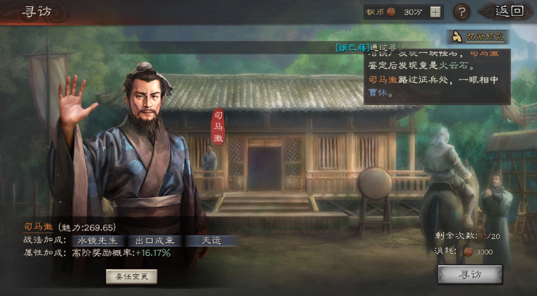 为了最大化司马徽的寻访效率,建议将他委任为寻访使并优先进行全魅力加点,这样在40级未进阶时魅力值可提升至308点左右,从而进一步增加高阶奖励的产出可能性。战法选择上应注重基础属性提升,例如出口成章类增加魅力的战法能有效辅助,但不宜过度投入战法点,通常升至5级即可获得性价比最高的收益,避免资源浪费。