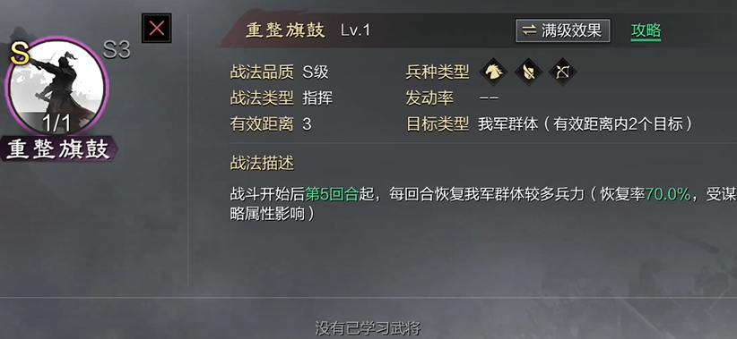 因其自带指挥型恢复战法皇裔流离,其战法配置与属性加点必须围绕最大化恢复量与增强团队生存这一核心展开。加点方面,唯一且最优的方案是全谋略加点。尽管其谋略成长值较低,但其战法皇裔流离的恢复效果完全受益于谋略属性,每一点谋略值的提升都能直接转化为更高效的兵力恢复,任何将属性点分配给防御或速度的做法都会显著削弱其核心辅助能力。通过贯彻全谋略的加点策略,才能确保他在战斗中提供稳定且可观的恢复支持,这是发挥其战术价值的绝对前提。